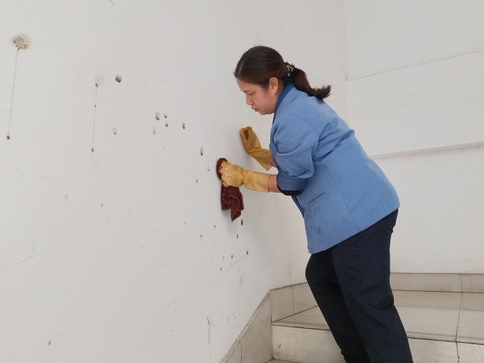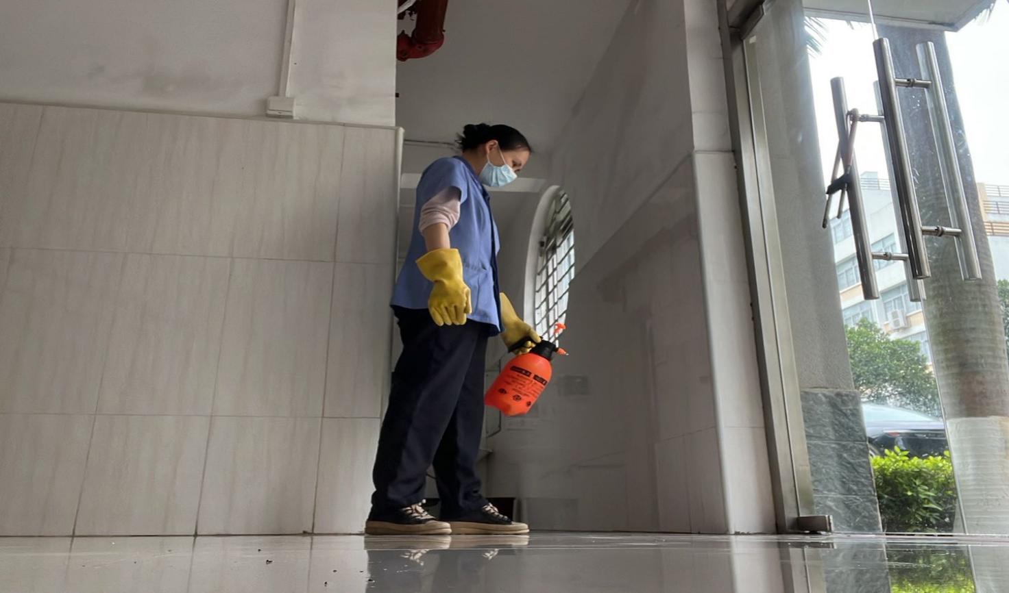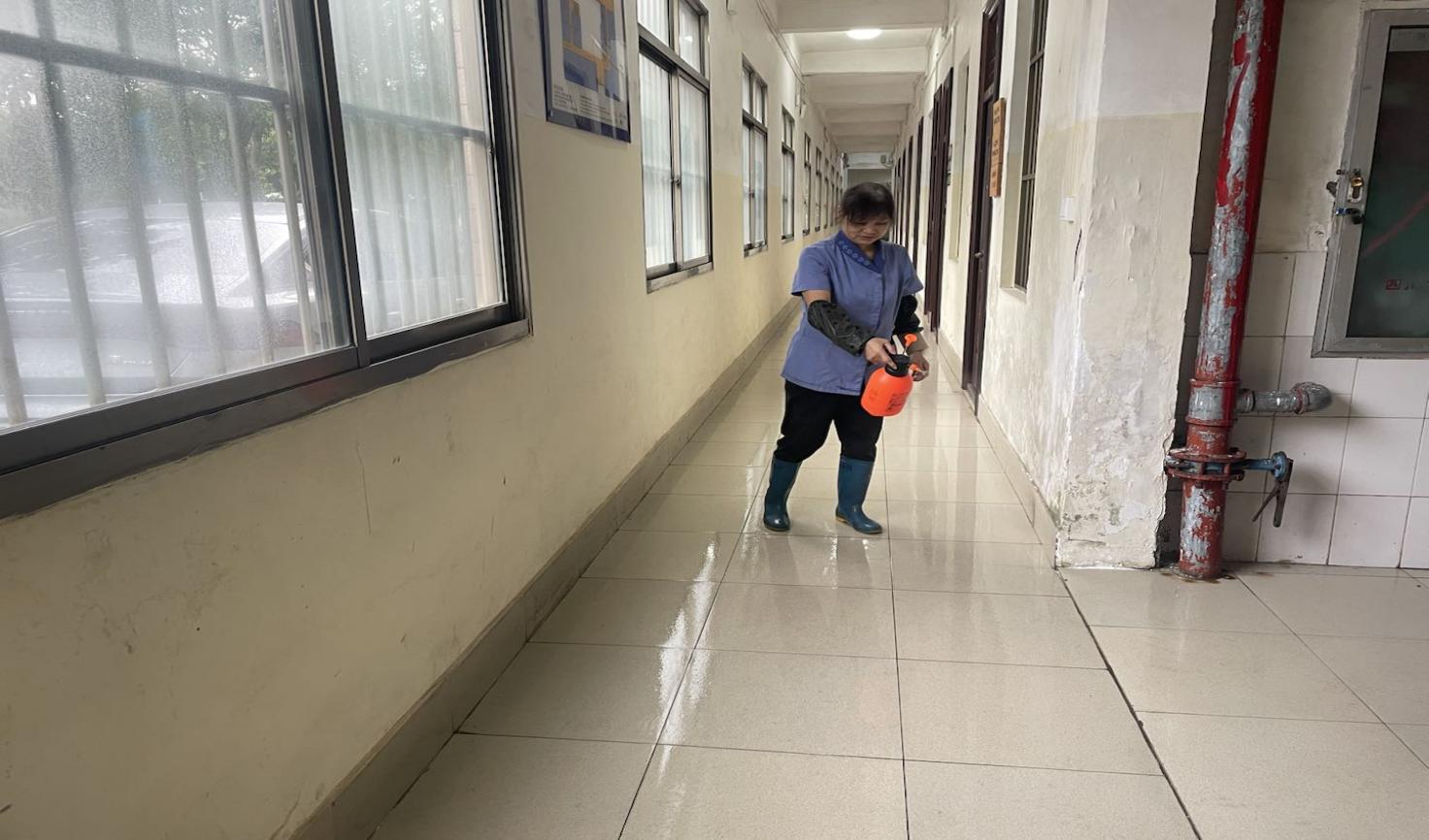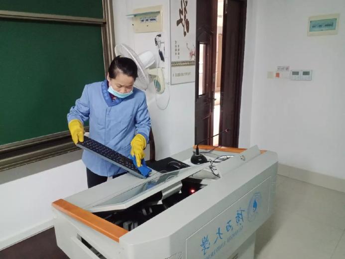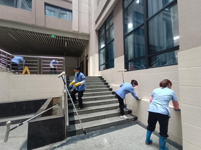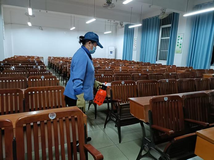 对公共教学楼宇的楼梯、走廊、门把手、课桌椅、电脑键盘、鼠标、水龙头、楼梯扶手、电梯间及按钮等高频接触表面进行重点杀菌消毒525次。