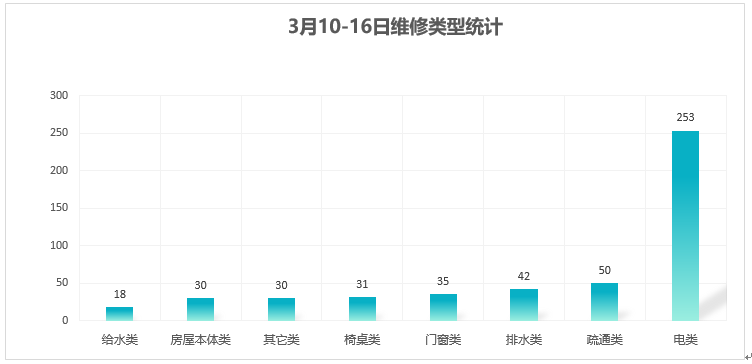 对学校公共设施进行日常巡查、维护,对师生报修问题及时维修、抢修,确保公共设施设备正常使用。本周共接单489单,其中电类253单,给水类18单,门窗类35单,排水类42单,疏通类50单,房屋本体类30单,桌椅类31单,其他类30单,完成450单。