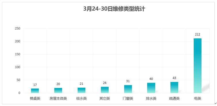 对学校公共设施进行日常巡查、维护,对师生报修问题及时维修、抢修,确保公共设施设备正常使用。本周共接单408单,其中电类212单,给水类21单,门窗类31单,排水类40单,疏通类43单,房屋本体类20单,桌椅类17单,其他类24单,完成383单。