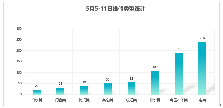 对学校公共设施进行日常巡查、维护,对师生报修问题及时维修、抢修,确保公共设施设备正常使用。本周共接单734单,其中电类239单,给水类22单,门窗类32单,排水类107单,疏通类55单,房屋本体类190单,桌椅类38单,其他类51单,完成661单。