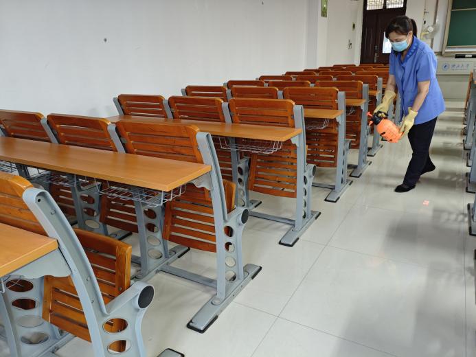 对公共教学楼宇的楼梯、走廊、门把手、课桌椅、电脑键盘、鼠标、水龙头、楼梯扶手、电梯间及按钮等高频接触表面进行重点杀菌消毒541次。