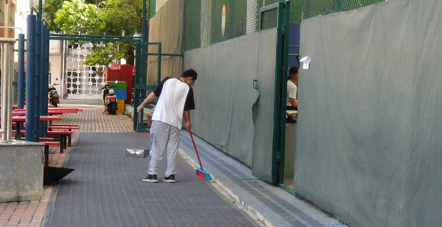 大学生在网球中心开展卫生保洁工作