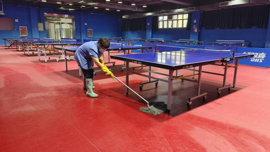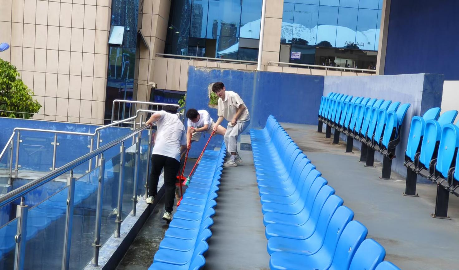 大学生在网球中心开展卫生保洁工作