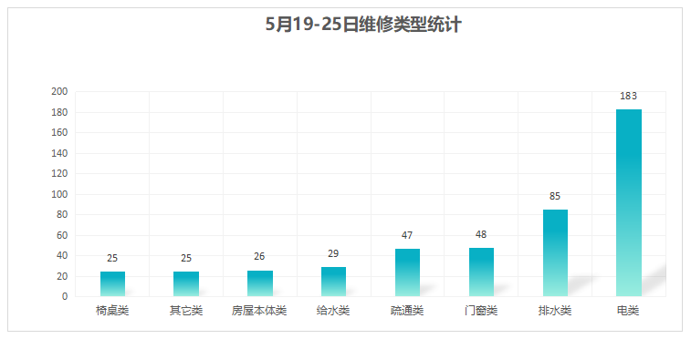 对学校公共设施进行日常巡查、维护,对师生报修问题及时维修、抢修,确保公共设施设备正常使用。本周共接单468单,其中电类183单,给水类29单,门窗类48单,排水类85单,疏通类47单,房屋本体类26单,桌椅类25单,其他类25单,完成463单。