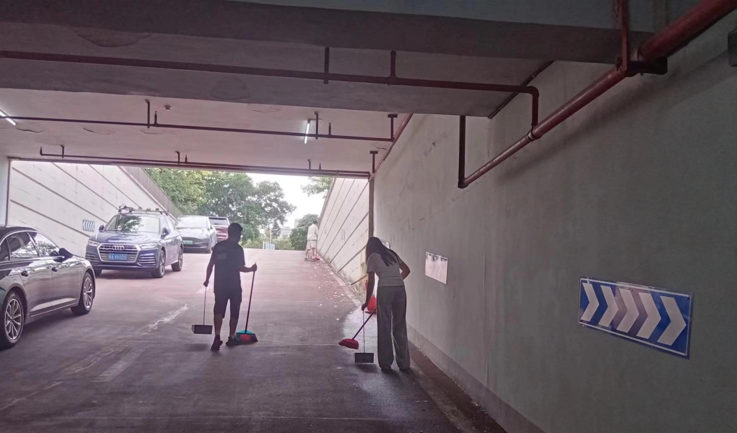 大学生在南大门地下停车场开展卫生保洁工作