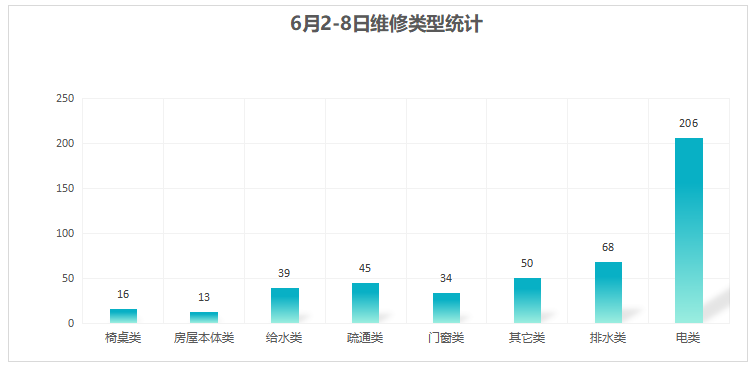 对学校公共设施进行日常巡查、维护,对师生报修问题及时维修、抢修,确保公共设施设备正常使用。本周共接单471单,其中电类206单,给水类39单,门窗类34单,排水类68单,疏通类45单,房屋本体类13单,桌椅类16单,其他类50单,完成471单。