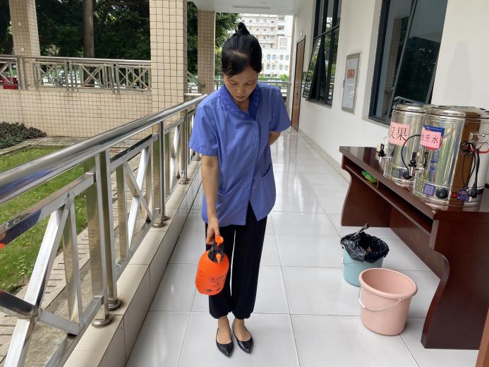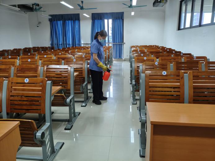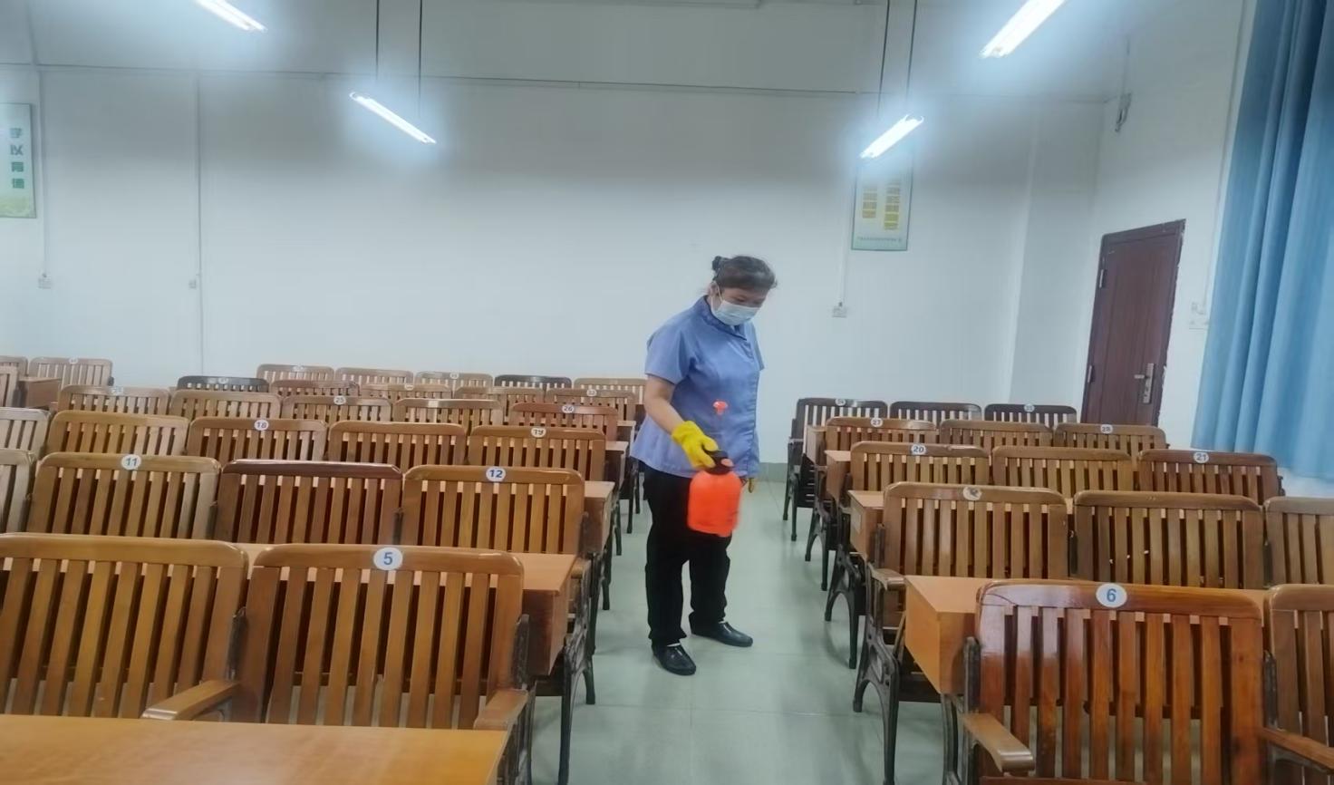 对公共教学楼宇的楼梯、走廊、门把手、课桌椅、电脑键盘、鼠标、水龙头、楼梯扶手、电梯间及按钮等高频接触表面进行重点杀菌消毒578次。
