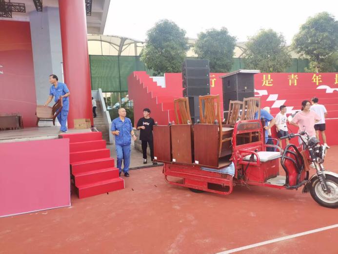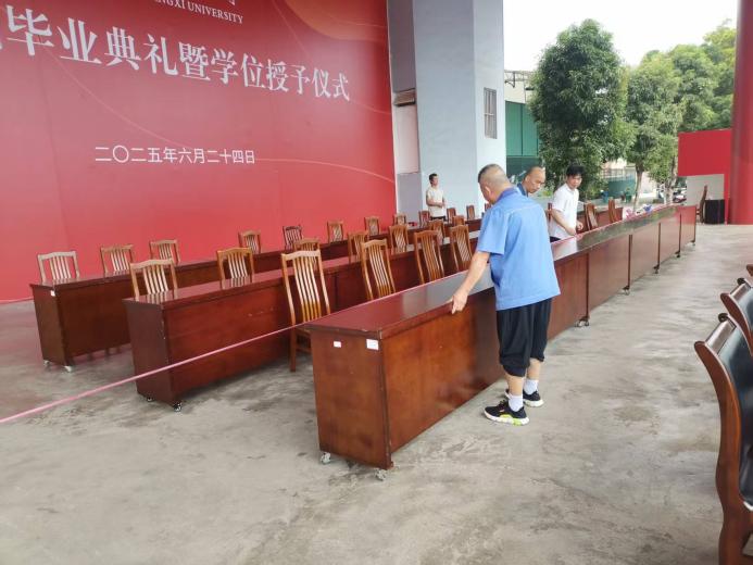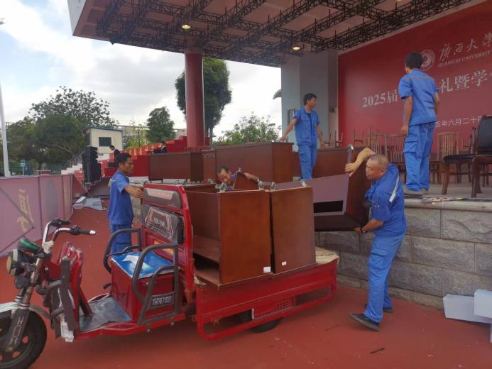 毕业典礼结束后主席台桌椅撤离工作
