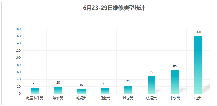 对学校公共设施进行日常巡查、维护,对师生报修问题及时维修、抢修,确保公共设施设备正常使用。本周共接单361单,其中电类160单,给水类20单,门窗类15单,排水类66单,疏通类49单,房屋本体类15单,桌椅类13单,其他类23单,完成361单。
