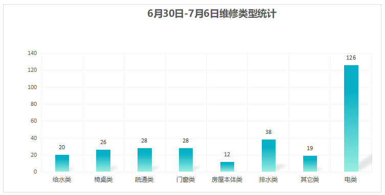 对学校公共设施进行日常巡查、维护,对师生报修问题及时维修、抢修,确保公共设施设备正常使用。本周共接单297单,其中电类126单,给水类20单,门窗类28单,排水类38单,疏通类28单,房屋本体类12单,桌椅类26单,其他类19单,完成304单。