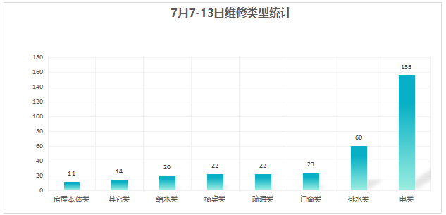 对学校公共设施进行日常巡查、维护,对师生报修问题及时维修、抢修,确保公共设施设备正常使用。本周共接单327单,其中电类155单,给水类20单,门窗类23单,排水类60单,疏通类22单,房屋本体类11单,桌椅类22单,其他类14单,完成310单。