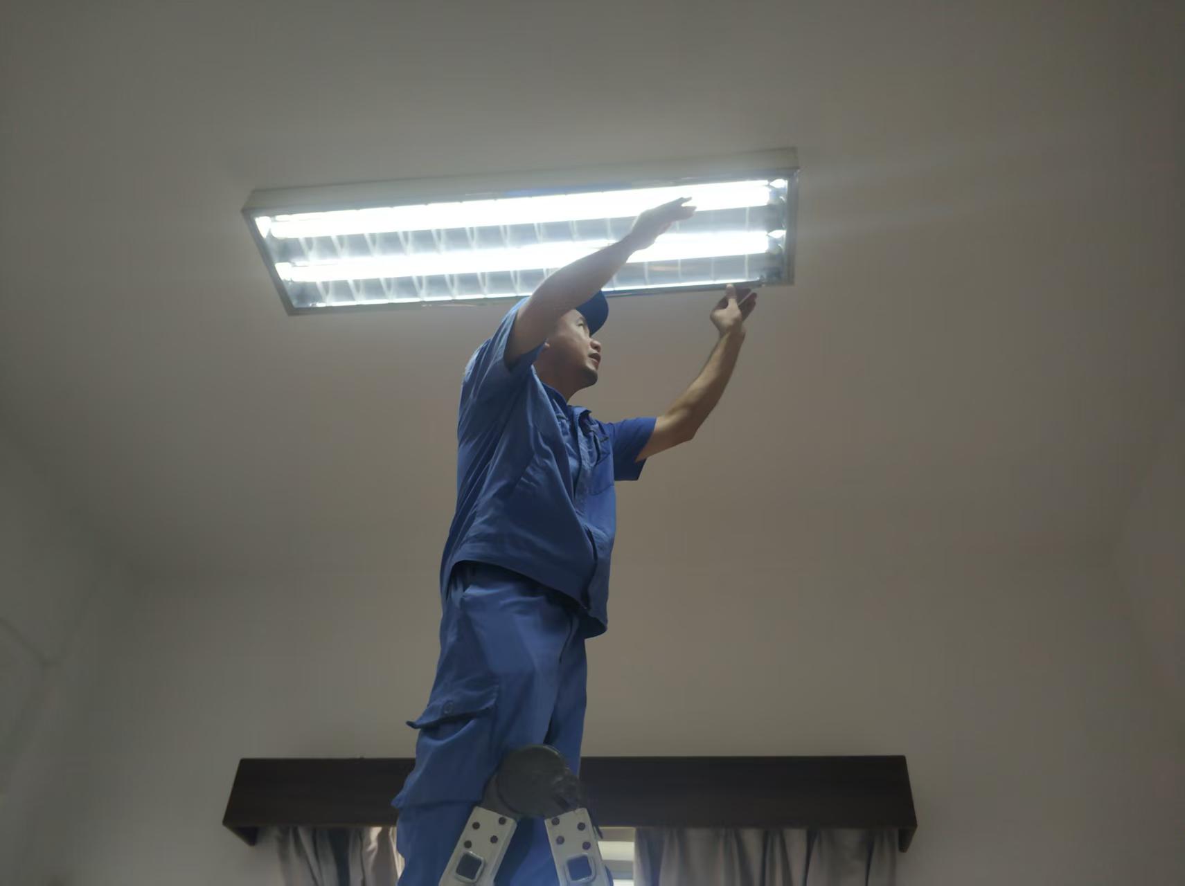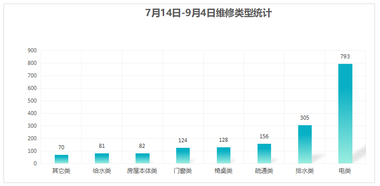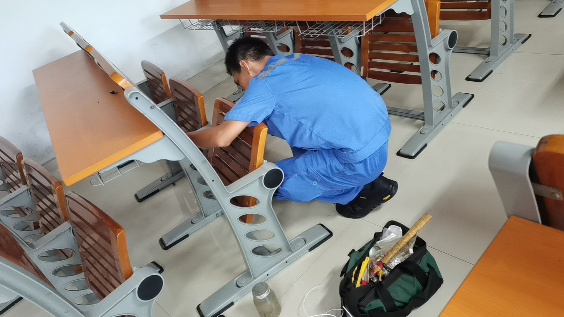 对学校公共设施进行日常巡查、维护,对师生报修问题及时维修、抢修,确保公共设施设备正常使用。暑假期间共接单1739单,其中电类793单,给水类81单,门窗类124单,排水类305单,疏通类156单,房屋本体类82单,桌椅类128单,其他类70单,完成1584单。