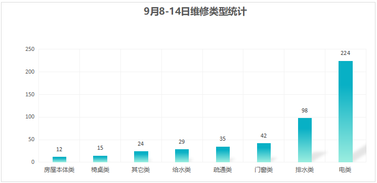 对学校公共设施进行日常巡查、维护,对师生报修问题及时维修、抢修,确保公共设施设备正常使用。本周共接单479单,其中电类224单,给水类29单,门窗类42单,排水类98单,疏通类35单,房屋本体类12单,桌椅类15单,其他类24单,完成479单。