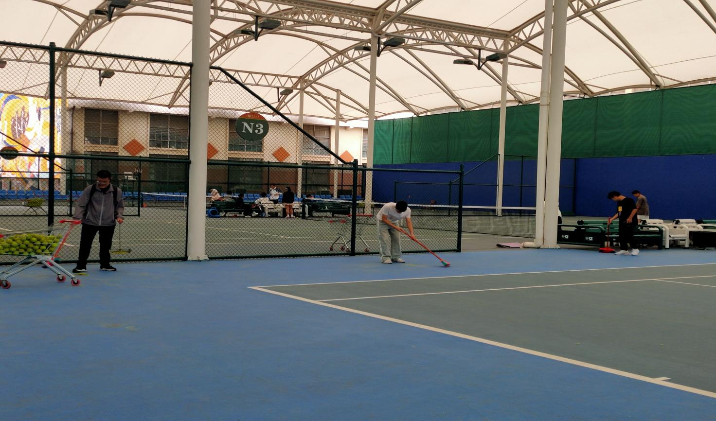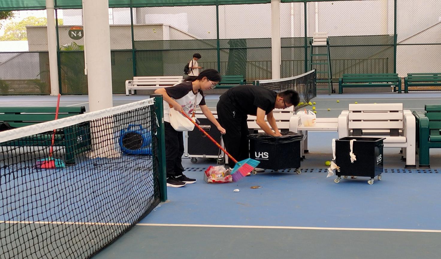 大学生在网球中心开展卫生保洁服务
