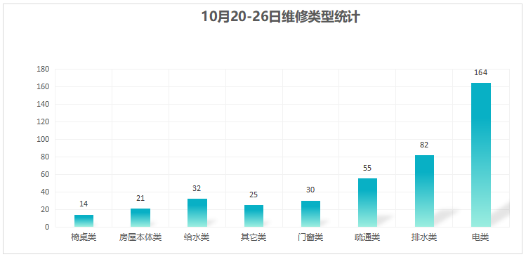 对学校公共设施进行日常巡查、维护,对师生报修问题及时维修、抢修,确保公共设施设备正常使用。本周共接单423单,其中电类164单,给水类32单,门窗类30单,排水类82单,疏通类55单,房屋本体类21单,桌椅类14单,其他类25单,完成423单。