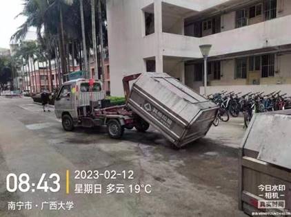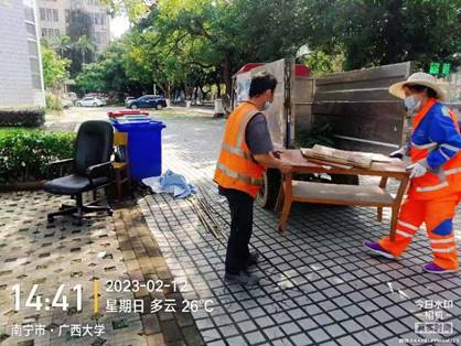 做好垃圾收集及清运工作,做到垃圾日产日清。在日常工作期间做好清运车辆、垃圾中转站及设备等消毒工作。另外对垃圾桶及周边卫生进行清洁打扫,保持垃圾桶周边干净整洁。在开学期间加大对学生宿舍垃圾的清运力度,加班加点连续清运。开学期间清运生活垃圾约268.5吨,大件垃圾约14.8吨,绿化垃圾约16.2吨。
