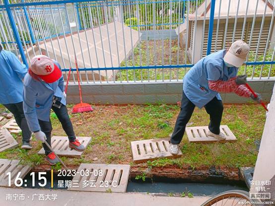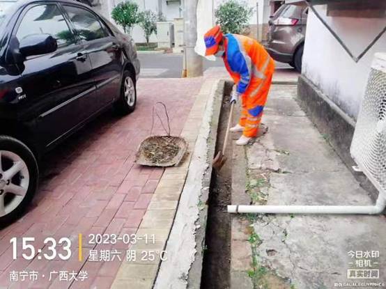 对校园各区域环境卫生进行日常清扫保洁,并对水沟进行持续清理,加强建筑垃圾巡查工作。对公共区域路灯、盖板、路面、健身器材、公共设施设备等问题进行排查。做好日常卫生巡查及清扫,保证校园各道路干净整洁。本周共对公共区域路面损坏维修共10处,井盖盖板维修共15处,更换雨水盖板25处。