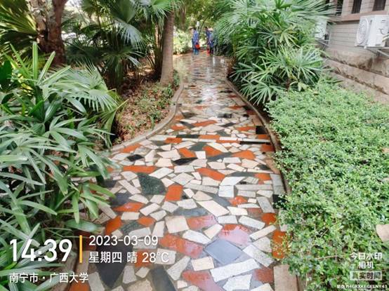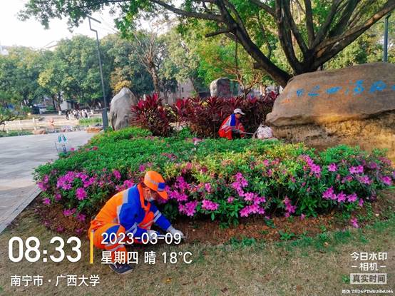 继续做好校园绿化养护工作,本周对劝学岛、南大门、大学生活动中心、汇学堂周边、土木平台等区域淋水;东校园西区6栋、西校园中区4栋、行健学院等区域勾枯枝、低枝;新东园、校办周边、熊猫园、沙梨园、艺术学院等区域松土拔杂草;碧云湖周边、六教周边、时光广场、劝学岛区域等区域清理枯叶、落叶;西校园东区13栋、西校园东区10栋、东校园中区27栋等区域清理寄生、菟丝子;碧云湖、六教、时光广场、十教等区域修剪绿篱等工作。本周完成机械打草12155平方米,淋水53523平方米,绿篱修剪5521平方米,拔杂草13121平方米,造型修剪125棵,修枯枝、低枝、寄生2012棵,树盆修整125棵,施肥12541平方米,病虫害消杀1252平方米。