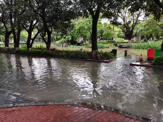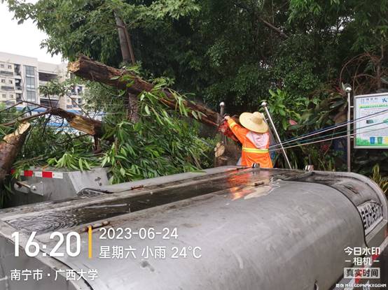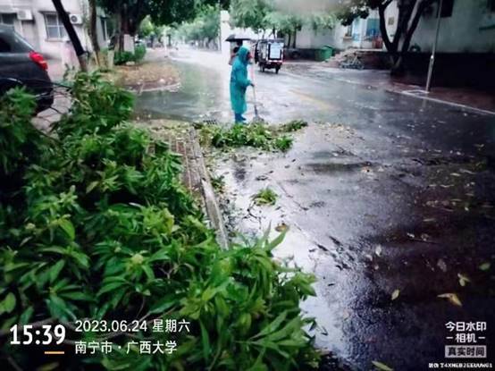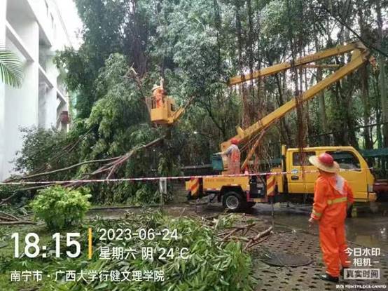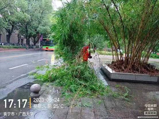 6月22日至26日,南宁市迎来暴雨天气,后勤服务管理岗与物业公司立即启动应急预案,加强对公共区域设施、东高地下室积水井、校内易涝路段及倒伏树木、断枝、坠枝、垂枝的巡查处理,成立应急抢险小分队随时处置突发情况。截止6月26日中午,共处理断枝53棵,处理垂枝、坠枝97棵,处理倒伏19棵。同时,加强对校内各湖面水位巡查,对水位过高的湖泊打开闸口进行排水降水处理。对积水严重的月牙湖路面也进行了排水降水处理。
