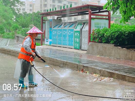 对校园各区域环境卫生进行日常保洁及专项消毒消杀工作,清扫保洁作业面积近80万平方米,校各大门通道消杀累计2541平方米,对水沟进行持续清理疏通,加强建筑垃圾巡查工作。对公共区域路灯、盖板、路面、健身器材、公共设施设备等问题进行排查,对各主支干道破损路面进行维修,对公共区域安全隐患巡查等工作。本周共对公共区域路面损坏维修共8处,井盖盖板维修共9处。由于本周南宁市有暴雨天气,环卫工人也加大了雨后清扫保洁力度。