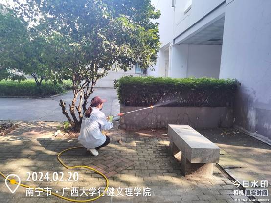 寒假期间环卫保洁板块继续对校园各区域环境卫生进行日常清扫保洁,全力打造干净整洁的校园环境。为了以更整洁优美舒适的校园面貌迎接新春佳节,2月2日起环境办联合博世科beats365亚洲版物业服务中心开展“‘掸新’辞旧岁,欢喜迎虎年”迎春节校园环境卫生整治专项活动,进行迎春大扫除。环卫工人清扫道路、冲洗广场地面、清洗铜像、持续清理水沟,清理落叶和捡拾绿化带白色垃圾等,活动持续到大年三十。