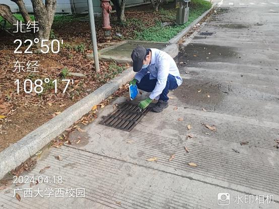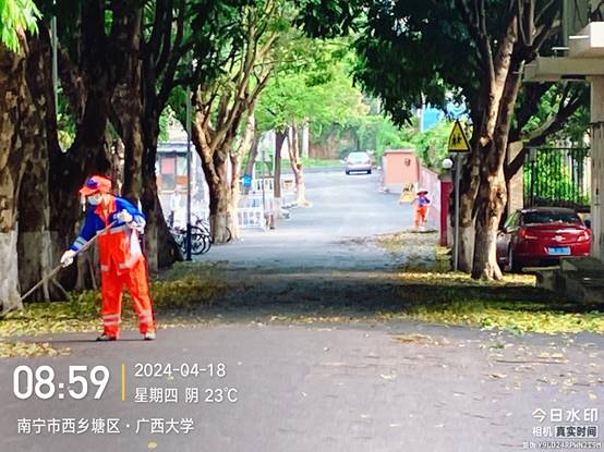 校园环卫保洁板块继续做好各公共区域环境卫生进行日常清扫保洁工作,每日清晨5点半就开始清扫校园的各大校道及支道,作业总面积近80万㎡。同时,对水沟、雨篦子等进行持续清理,保持排水畅通,并清理绿地落叶和绿化带砖块、白色垃圾,清洗果皮箱等,保持干净整洁的校园环境。本周有暴雨天气,环卫工人全天候巡逻,雨后迅速清理校园内的积水、落叶和废弃物等,确保校园环境及行人、车辆安全。