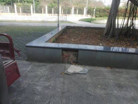 西体育馆东面树池围砖脱落维修前