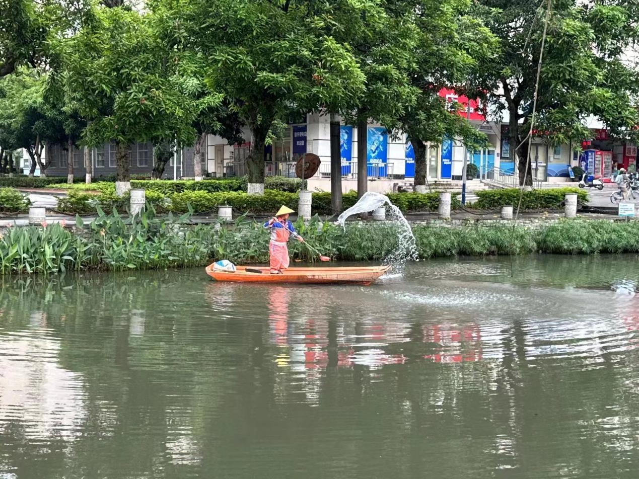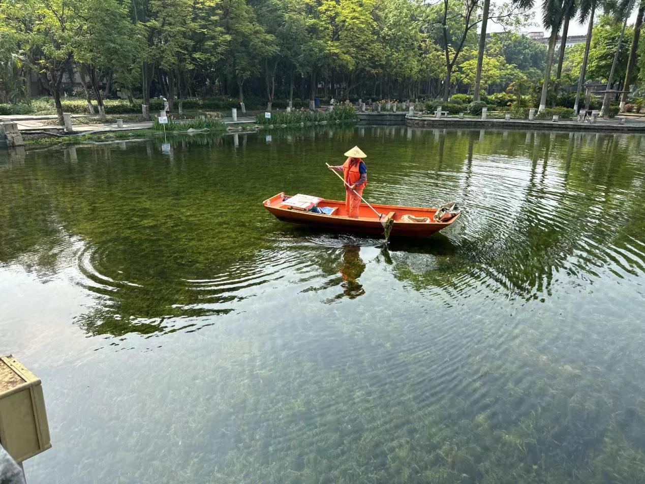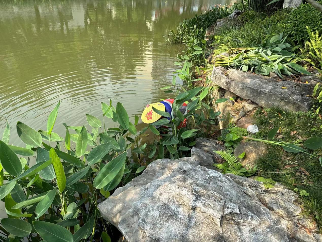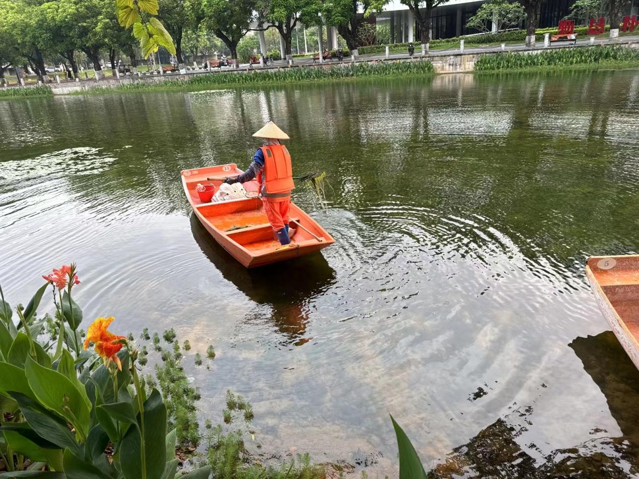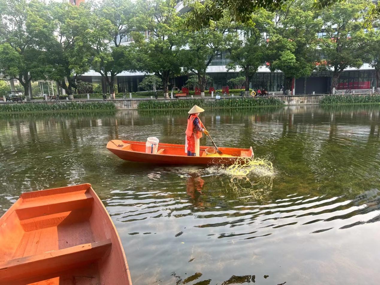 本周持续做好16个景观湖和4个景观池的湖水治理工作。湖泊运维员每日打捞湖面垃圾并清理大面积油膜,防止堆积,做到水面干净整洁;为控制杂鱼啃食水草对湖体生态造成影响,本周对绿榕湖、月牙湖、爱莲湖专项捕鱼,总计打捞45斤罗非鱼;各湖驳岸及时清理螺蛋,对翠湖、镜湖专项治理,总计打捞福寿螺245斤;本周雨水入湖较多,水位上涨期间进行降水排水作业;各湖雨后进行水质调理,月牙湖,莲湖污水入湖,进行污水水质调理,月牙湖五一期间污水入湖有红线虫漂浮水面,已进行应急消杀处理;对各调蓄池进行巡查,进行相应蓄水工作;秋实湖荷叶进行补肥作业,已完成;月牙湖、绿榕湖、紫荆湖、鉴湖修剪驳岸美人蕉及拔杂草,提升了景观效果;大碧云湖、小碧云湖、鉴湖、爱莲湖、莲湖对水底水草附着的青苔、泥皮进行清除打捞作业,持续进行中;绿榕湖、鉴湖、小碧云湖、观月湖、秋实湖修剪病虫害荷叶;秋实湖周边、翠湖东面修剪狐尾藻。此外,汛期即将来临,环境办本周在原有各景观湖泊已配备救生设备的基础上,补充采购10套救生圈安装在鲁班湖和行健学院附近的湖泊,并加立警示牌。