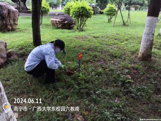 日常养护工作:对新东园、农学院、六教、校办周边、东校园中区、汇学堂、育才广场、行健学院、东校园东区、南门、东门、西门、西校园北区、西校园中区、国际学院、碧云湖等区域进行拔杂草、病虫害防治、清理菟丝子、草坪修整、绿篱修整、松土、绿地施肥、绿地清理落叶、枯叶和残叶等其他绿化养护作业。