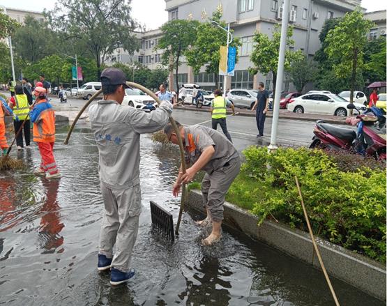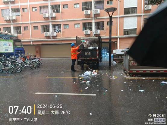 本周继续做好校园各区域环境卫生清扫保洁工作,环卫工人每天清晨5点半就开始清扫校园的各大校道及支道,环卫保洁总面积近80万㎡,人均6800㎡。与此同时,由于近期雨水天气持续不断,环卫保洁员工针对校园内可能出现内涝的区域,加大排险巡查力度,对雨水井、排水井、污水井等进行检查并清除井内杂物,确保排水系统畅通。在雨后及时清扫校内路面积水、清理落叶、垃圾等,保障校内环境卫生及行人、车辆安全通行。