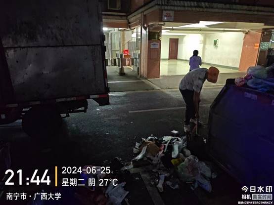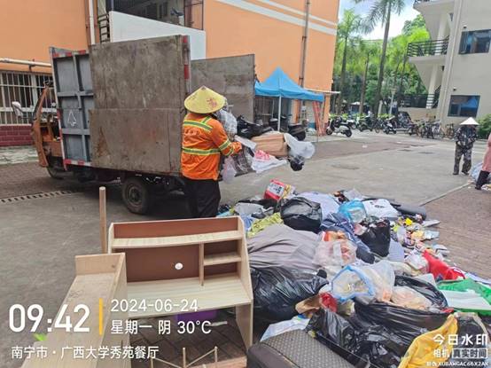 垃圾清运:按规定时间、路线清运校园垃圾,做到垃圾日产日清,并对垃圾桶和勾臂箱进行清洗和消杀。本周是毕业季垃圾清运的高峰季,为应对暴增的垃圾量,环境办和物业公司专门召开毕业季垃圾清运工作协调布置会,加派人手和车辆,加大垃圾清运频次,加班加点清运垃圾,确保毕业季垃圾如期正常清运完毕。