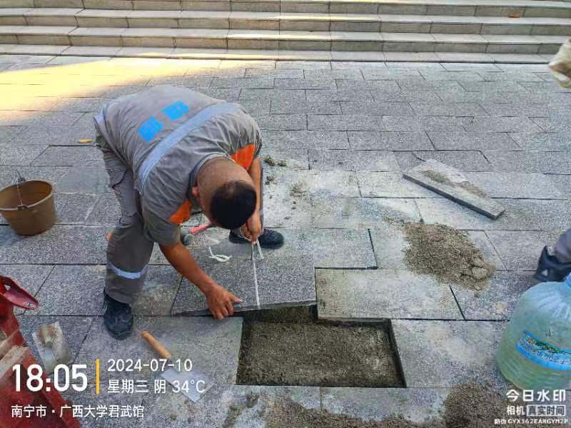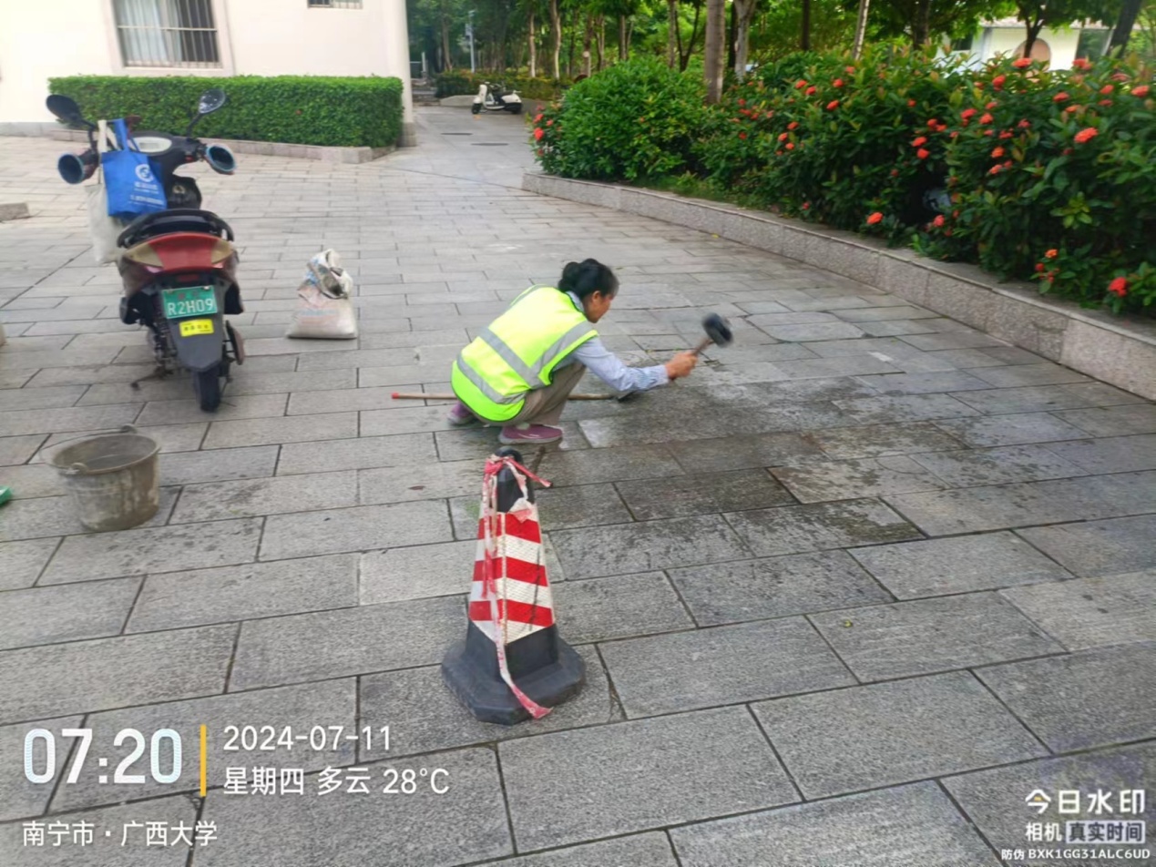 公共区域维修板块继续做好校内公共区域地面、路沿石、路灯、水沟盖板、健身器材等设施排查、维修、抢修工作;及时对校内雨篦子、井盖等排水系统进行排查、疏通。本周对校内公共区域道路路面、路灯、盖板等维修共29处,排水口疏通23次。