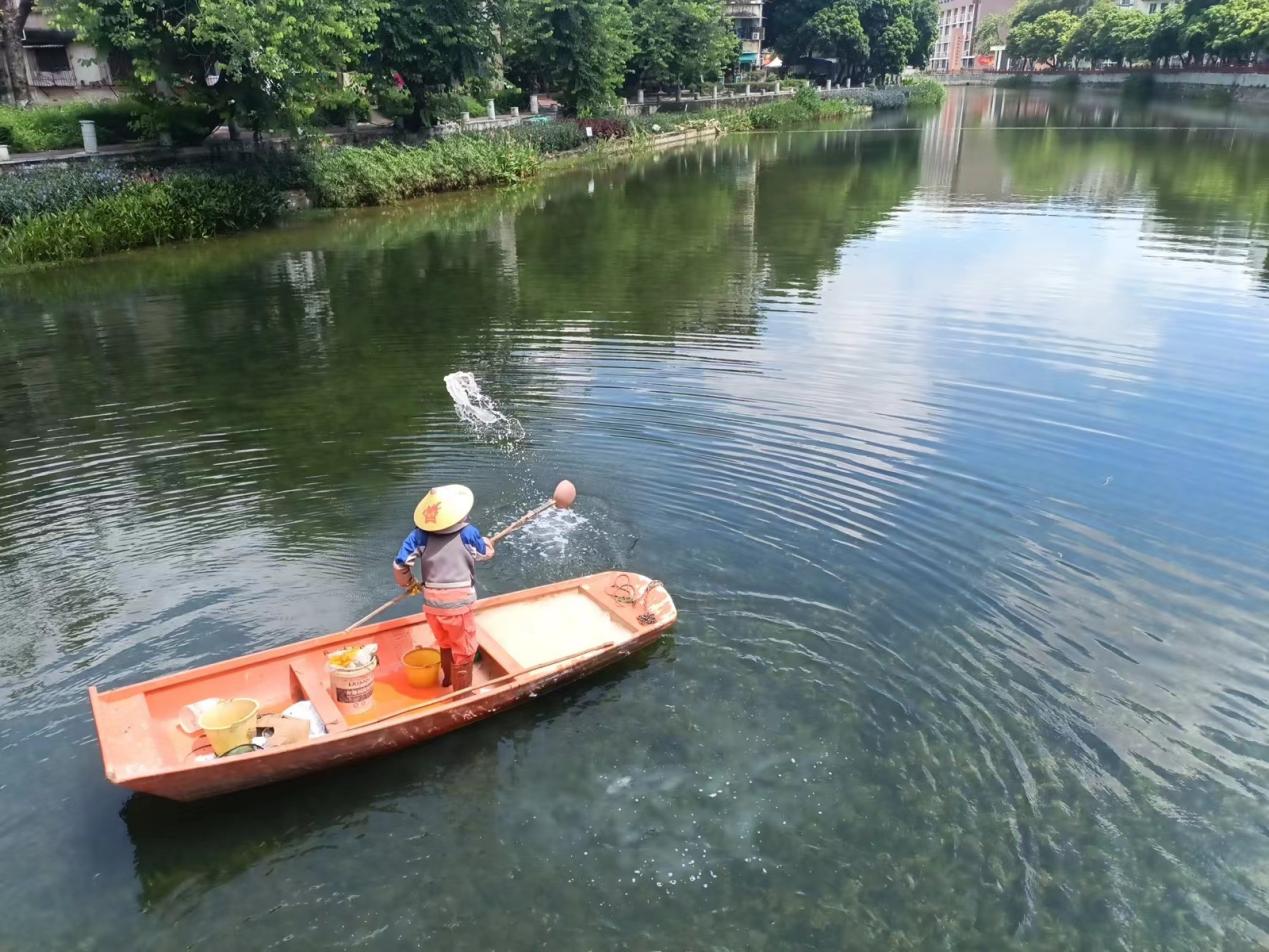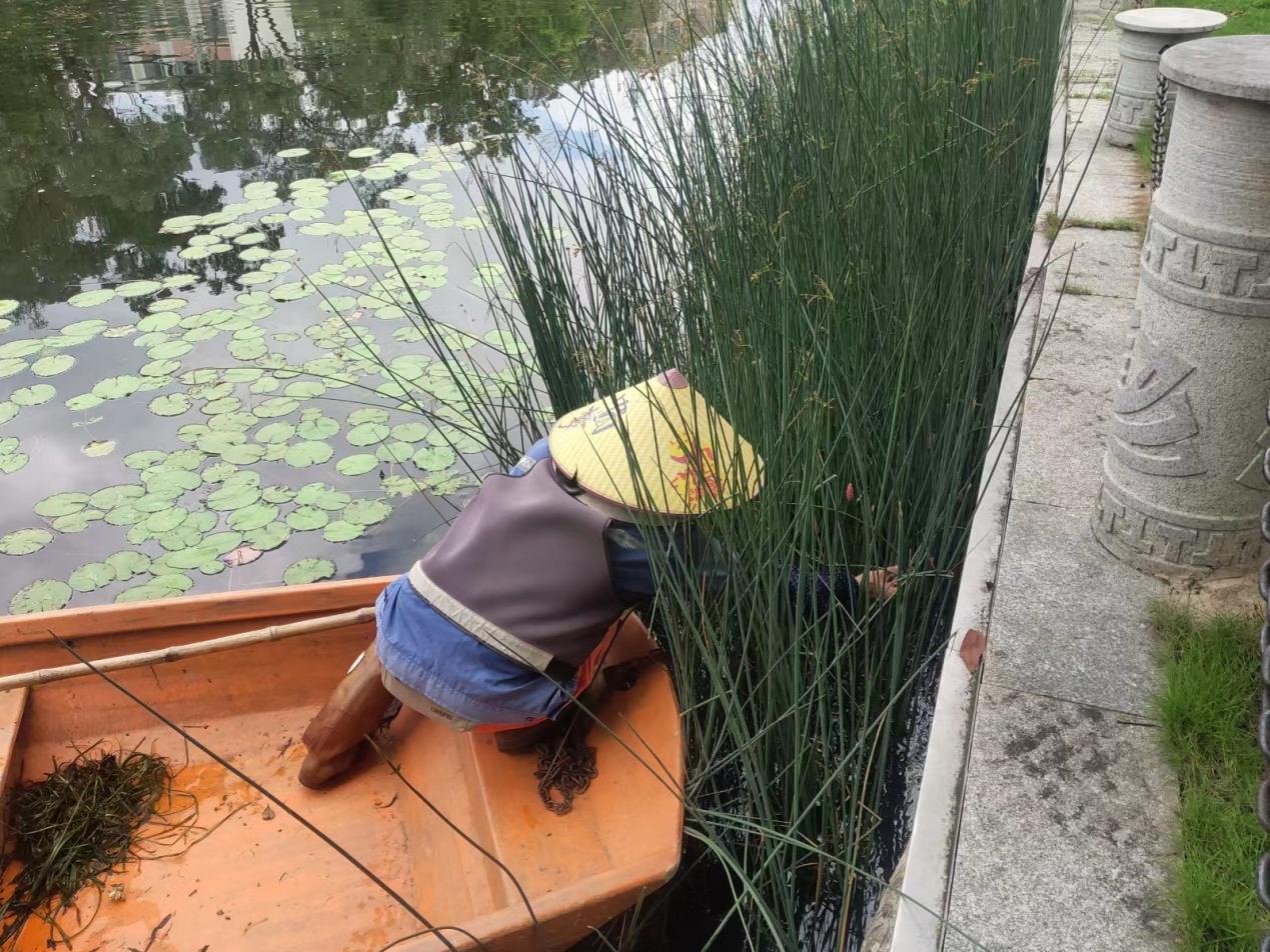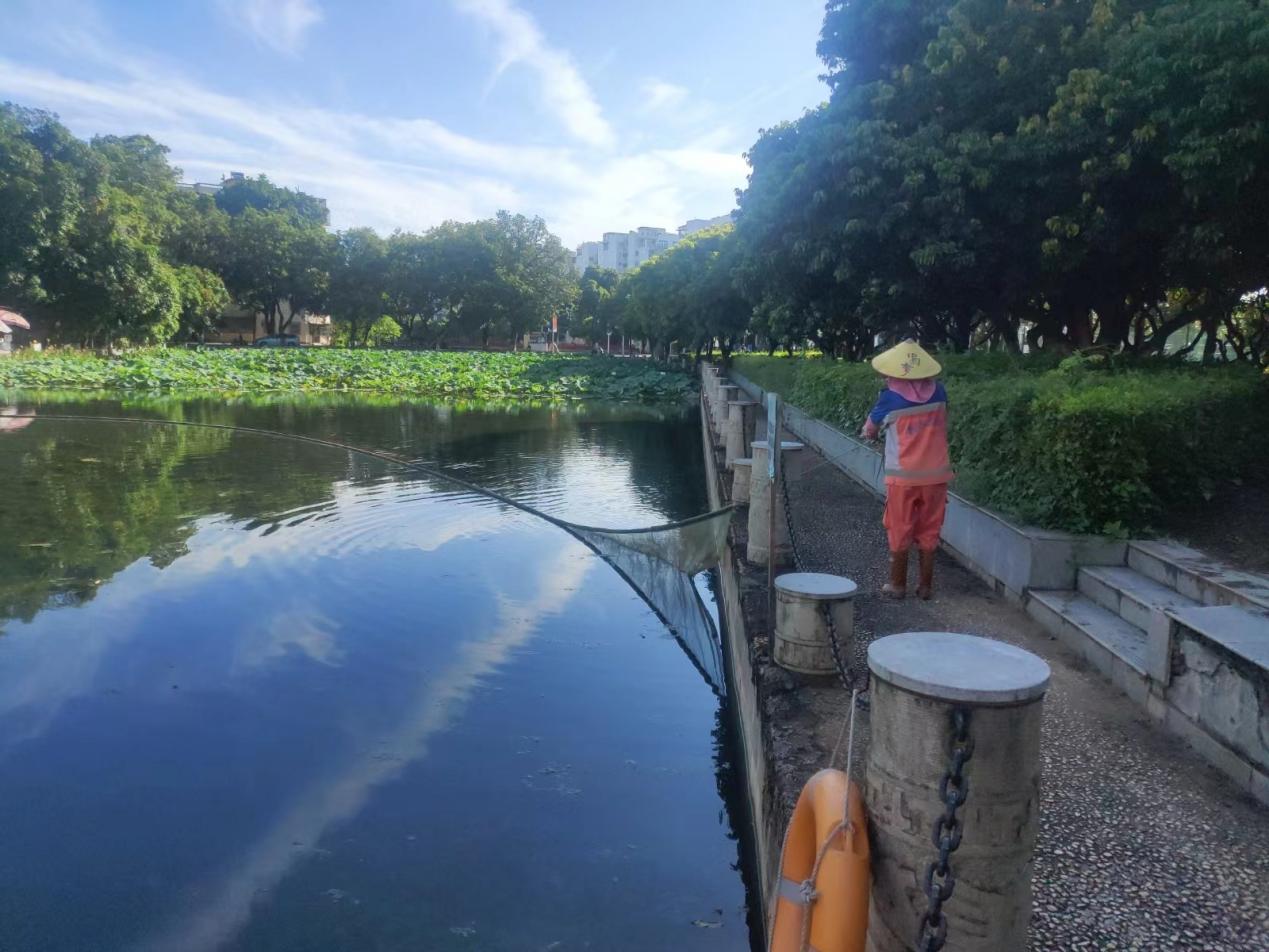持续做好16个景观湖和4个景观池的湖水治理工作,清理大面积油膜,防止堆积,做到水面干净整洁;控鱼常态化进行,本周集中对大碧云湖、小碧云湖、爱莲湖、莲湖捕捉杂鱼,总计捕捉杂鱼240斤;各湖驳岸及时清理福寿螺及螺蛋,打捞上浮福寿螺及螺蛋总计410斤;对月牙湖、大碧云湖、小碧云湖、莲湖和爱莲湖进行水质消毒;莲湖、绿榕湖、鉴湖进行水草修剪和青苔防治工作,绿榕湖、彩蝶湖、翠湖裸露区域进行水草补种;小碧云湖、爱莲湖、鉴湖、莲湖打捞水底丝状藻青苔;绿榕湖、月牙湖、荷湖、紫荆湖南段修剪枯萎荷叶;秋实湖南岸补种绿植;月牙湖进行第二轮水面蓝绿藻治理;16个景观湖和4个景观池总计清运垃圾10吨。
