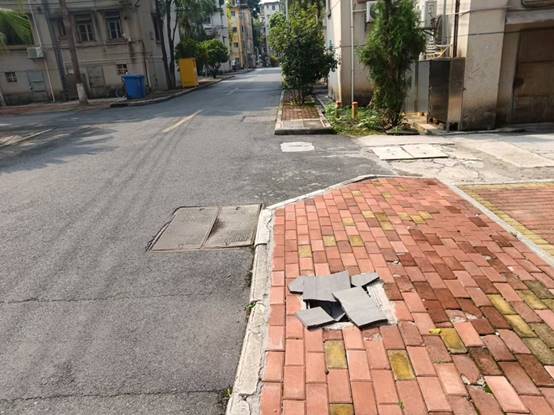 木工场路人行道修补破损的地砖