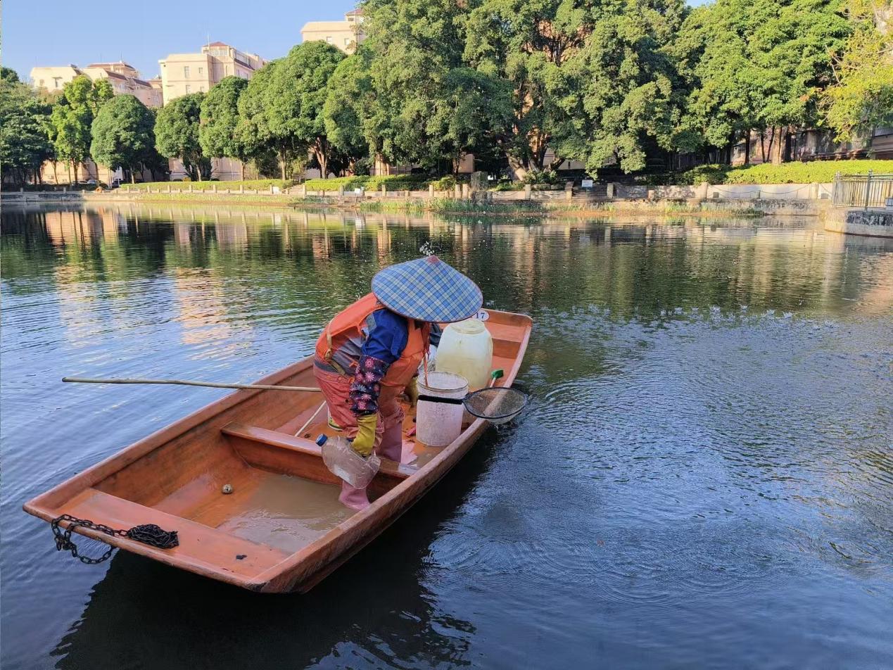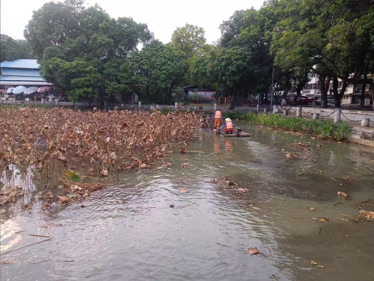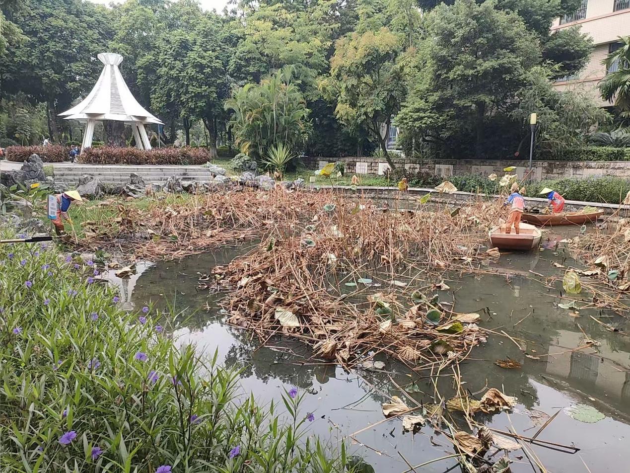 湖泊运维员每日进行湖面保洁、湖面油膜垃圾清理,保持水面干净整洁;大碧云湖、爱莲湖、秋实湖枯萎荷叶收割及沉底枯萎荷叶打捞清理;鉴湖、镜湖补种水草;爱莲湖西北角、秋实湖东岸美人蕉修剪,绿榕湖西岸菖蒲修剪;大碧云湖、小碧云湖继续打捞清理附在水草的青苔;鉴湖治理福寿螺后进行水质调理,去除水体异味;巡查各湖水位情况,大碧云湖水位低于正常水位,适当抽调蓄池水进行补充;劝学岛水池补水。