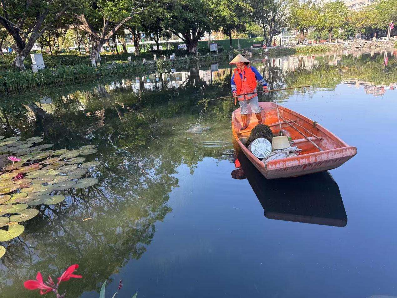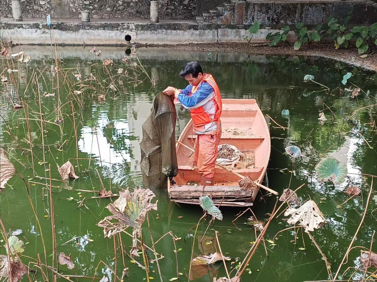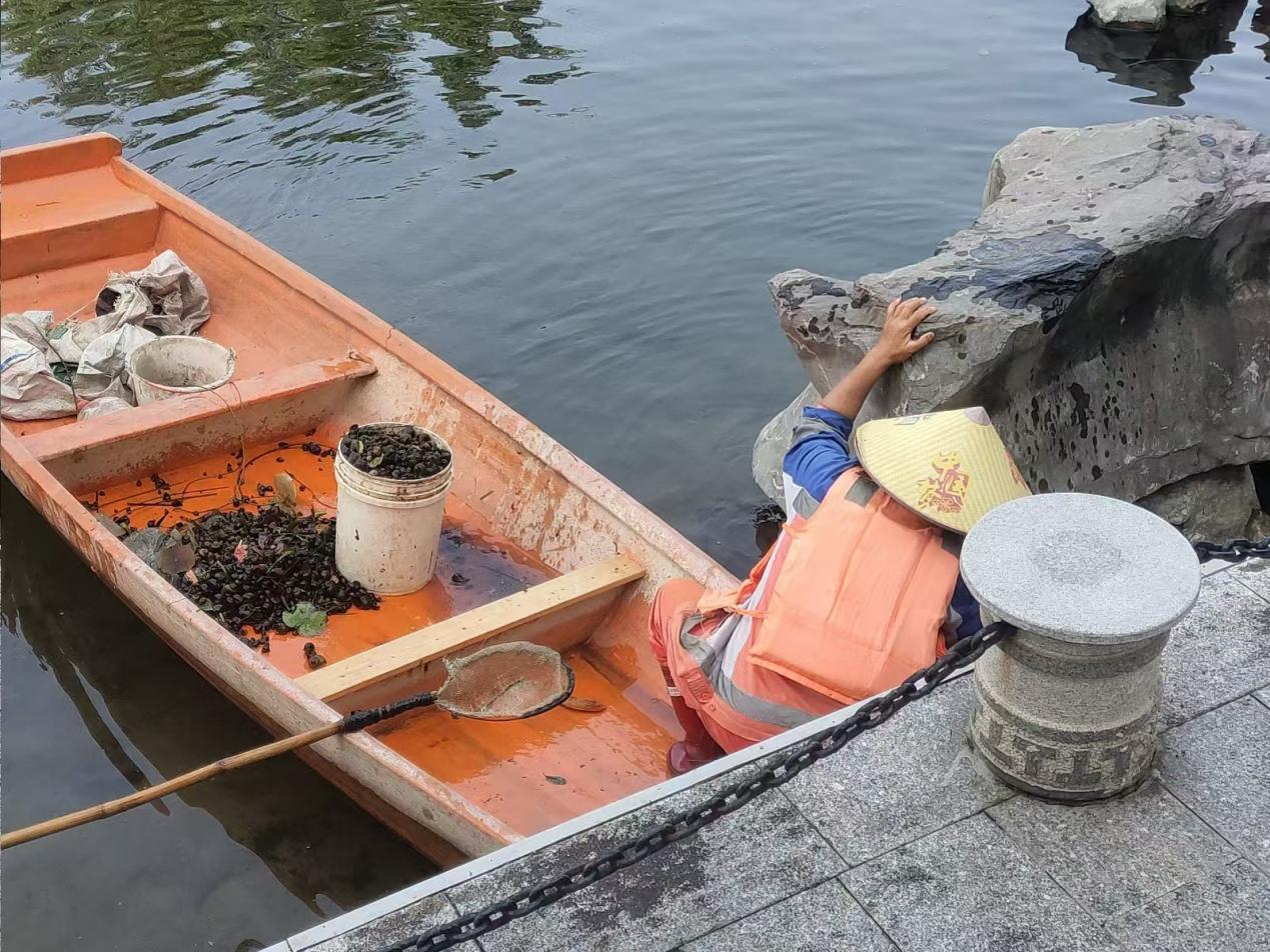 湖泊运维员每日进行湖面保洁、湖面油膜垃圾清理,保持水面干净整洁;大碧云湖、爱莲湖、秋实湖枯萎荷叶收割及沉底枯萎荷叶打捞清理;鉴湖、镜湖补种水草;爱莲湖西北角、秋实湖东岸美人蕉修剪,绿榕湖西岸菖蒲修剪;大碧云湖、小碧云湖继续打捞清理附在水草的青苔;鉴湖治理福寿螺后进行水质调理,去除水体异味;巡查各湖水位情况,大碧云湖水位低于正常水位,适当抽调蓄池水进行补充;劝学岛水池补水。
