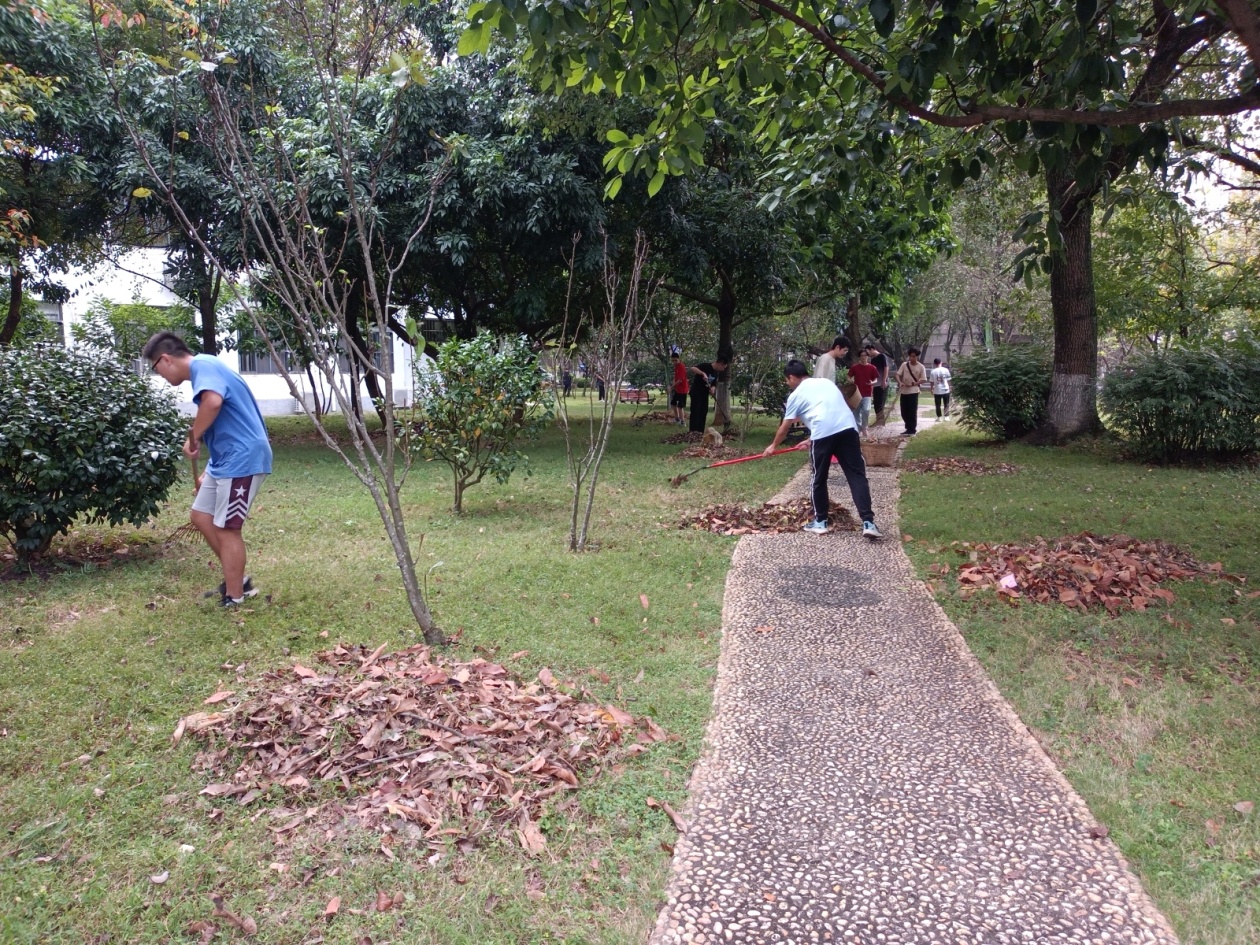 学生劳动实践课在沙梨园清理绿地落叶