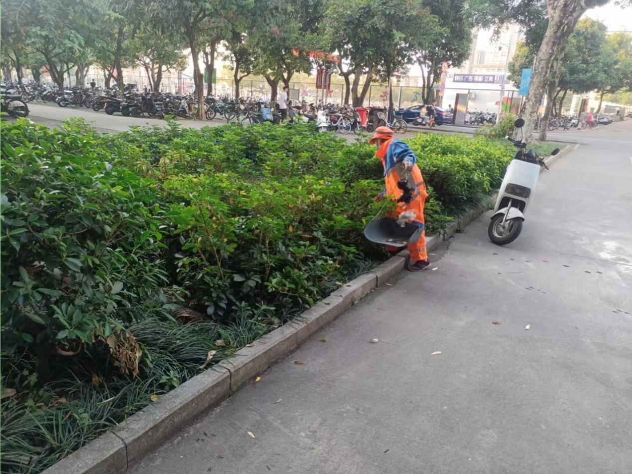 东门绿化带捡拾白色垃圾