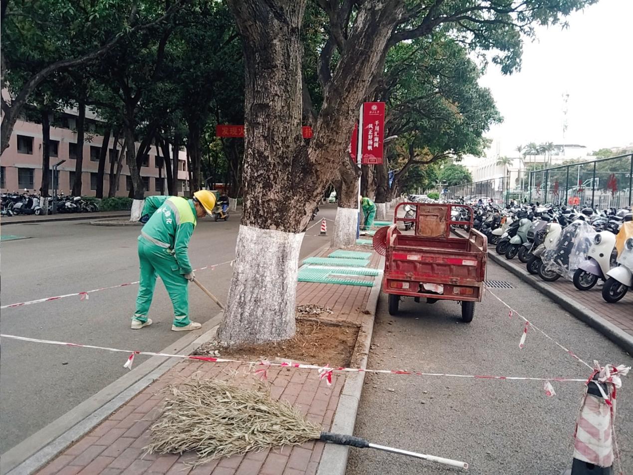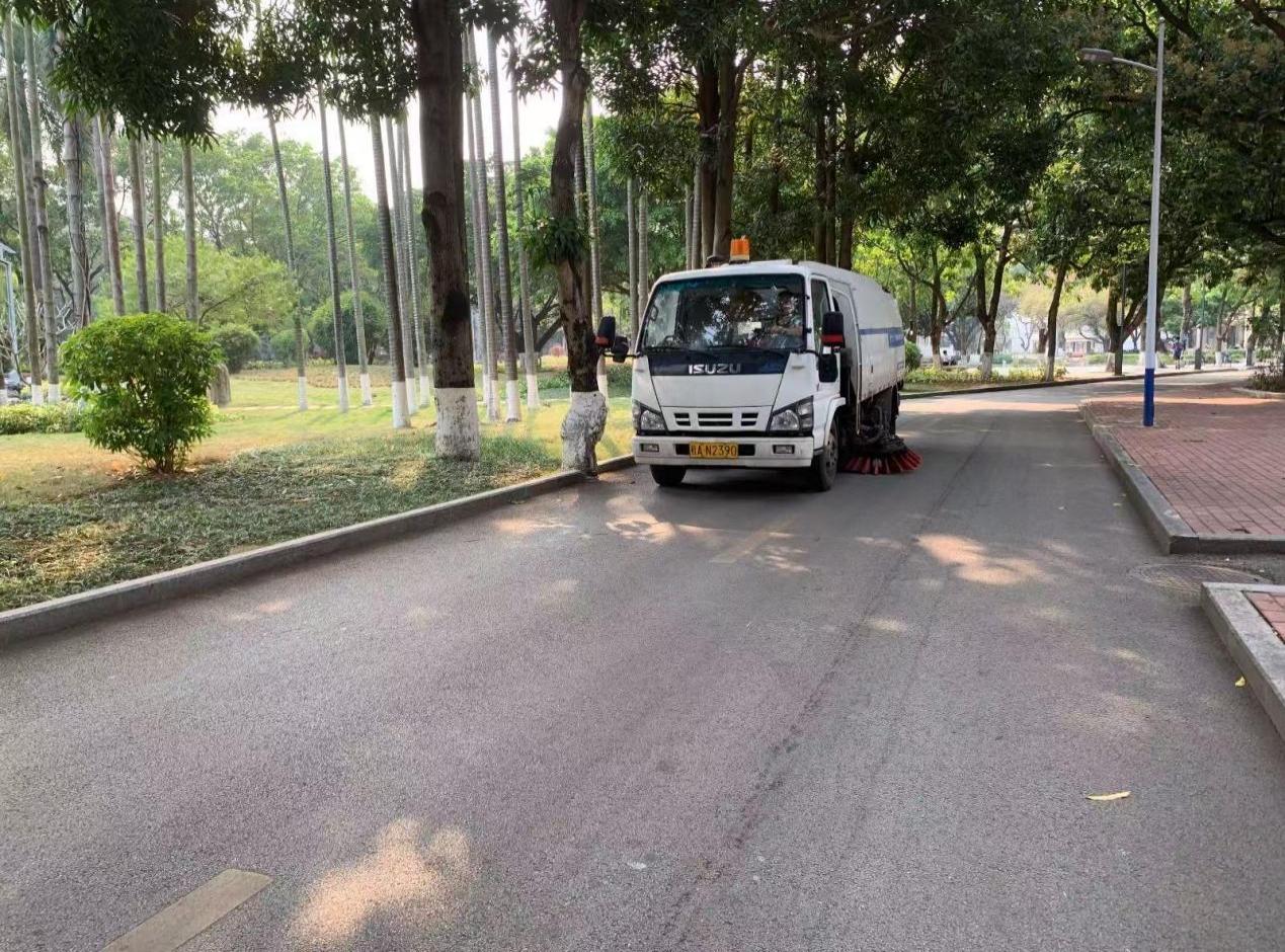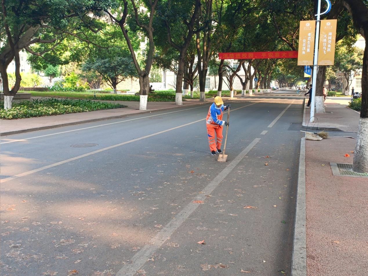 本周环卫保洁人员继续做好校园各区域环境卫生清扫保洁工作,每日清晨五点半开始采用“人机结合”的方式清扫校园的各大校道及支道,日常及时清理绿地枯枝落叶和白色垃圾,清洗铜像、果皮箱、清理水沟、雨篦子等,保持校园环境干净整洁。环卫保洁总面积近80万㎡,人均保洁6800㎡。