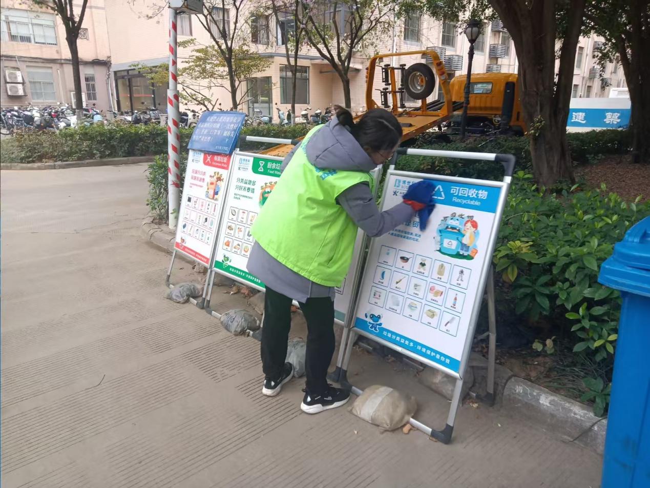 垃圾分类督导:按计划进行垃圾分类督导和宣传、垃圾分类宣传展板清洁和宣传单派发等工作,对校园进行全面巡查,及时处理发现的问题。