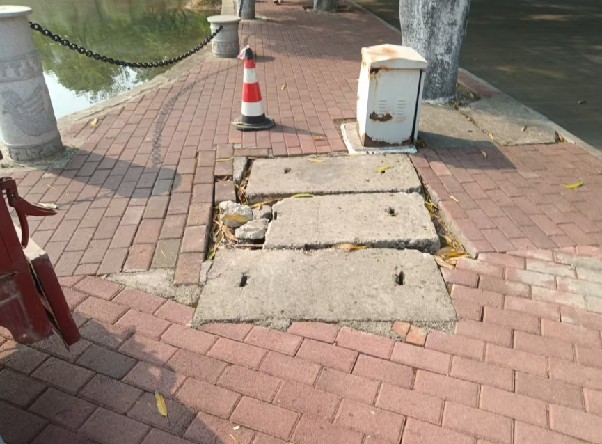 蝶山路北路与劝学岛路口水泥板断裂修复前