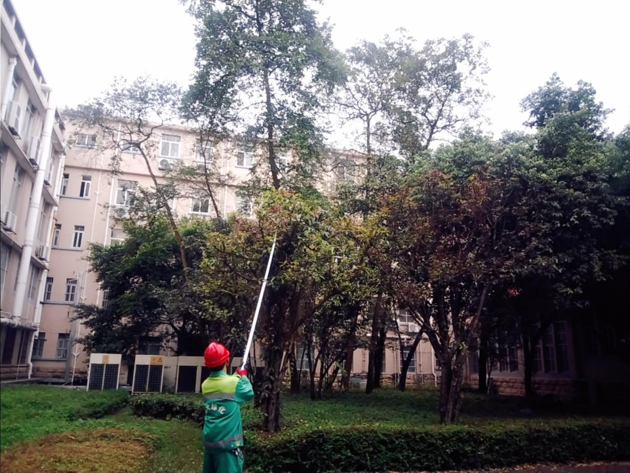 树木修剪:崇文路、熊猫园、君武路、蝶山路、六教、农场路、农学院北面、时光广场、大礼堂、学生公寓6B栋、东校园东区14至20栋、劝学岛、东体育场、法学院、东校园中区23栋、中转站假植地、新东园、北校园、西校园北区20栋、育才广场、工厂路、学生公寓30栋、中轴线、办公楼、学生公寓6B栋、碧云湖、汇学堂等区域进行枯枝处理,低枝、侧枝、寄生树和靠近电线、建筑物、路灯及摄像头等设施的树枝进行修剪。