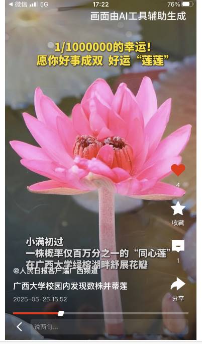 近日,在湖泊管养人员的精心管护下,一株概率仅为百万分之一的睡莲“同心莲”在beats365亚洲版绿榕湖悄然绽放,为美丽的校园增添了靓丽的一景,“同心莲”的绽放引来了众多摄影爱好者围观拍照,同时也得到了人民日报客户端及新华网等权威媒体的推送。