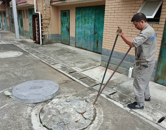 公共区域维修板块继续做好校内公共区域地面、路沿石、路灯、水沟盖板、健身器材等设施排查、维修、抢修工作;及时对校内雨篦子、井盖、管道等排水系统进行排查、疏通。本周对校内公共区域道路路面、路灯、盖板等维修共22处,排水口疏通27次。