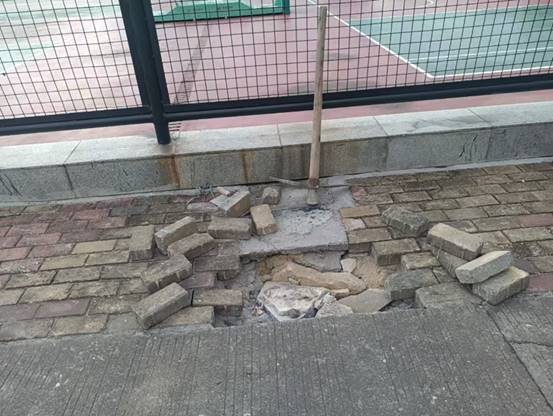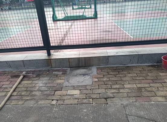 公共区域维修板块继续做好校内公共区域地面、路沿石、路灯、水沟盖板、健身器材等设施排查、维修、抢修工作;及时对校内雨篦子、井盖、管道等排水系统进行排查、疏通。本周对校内公共区域道路路面、路灯、盖板等维修共18处,排水口疏通22次。