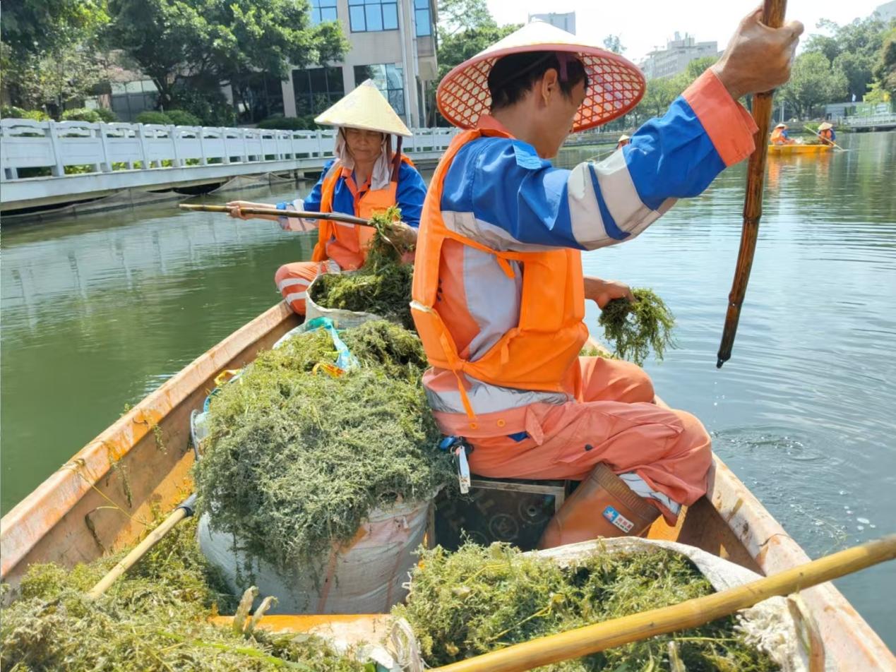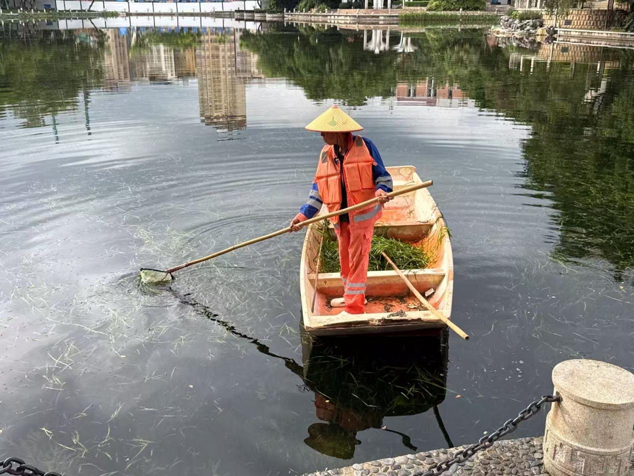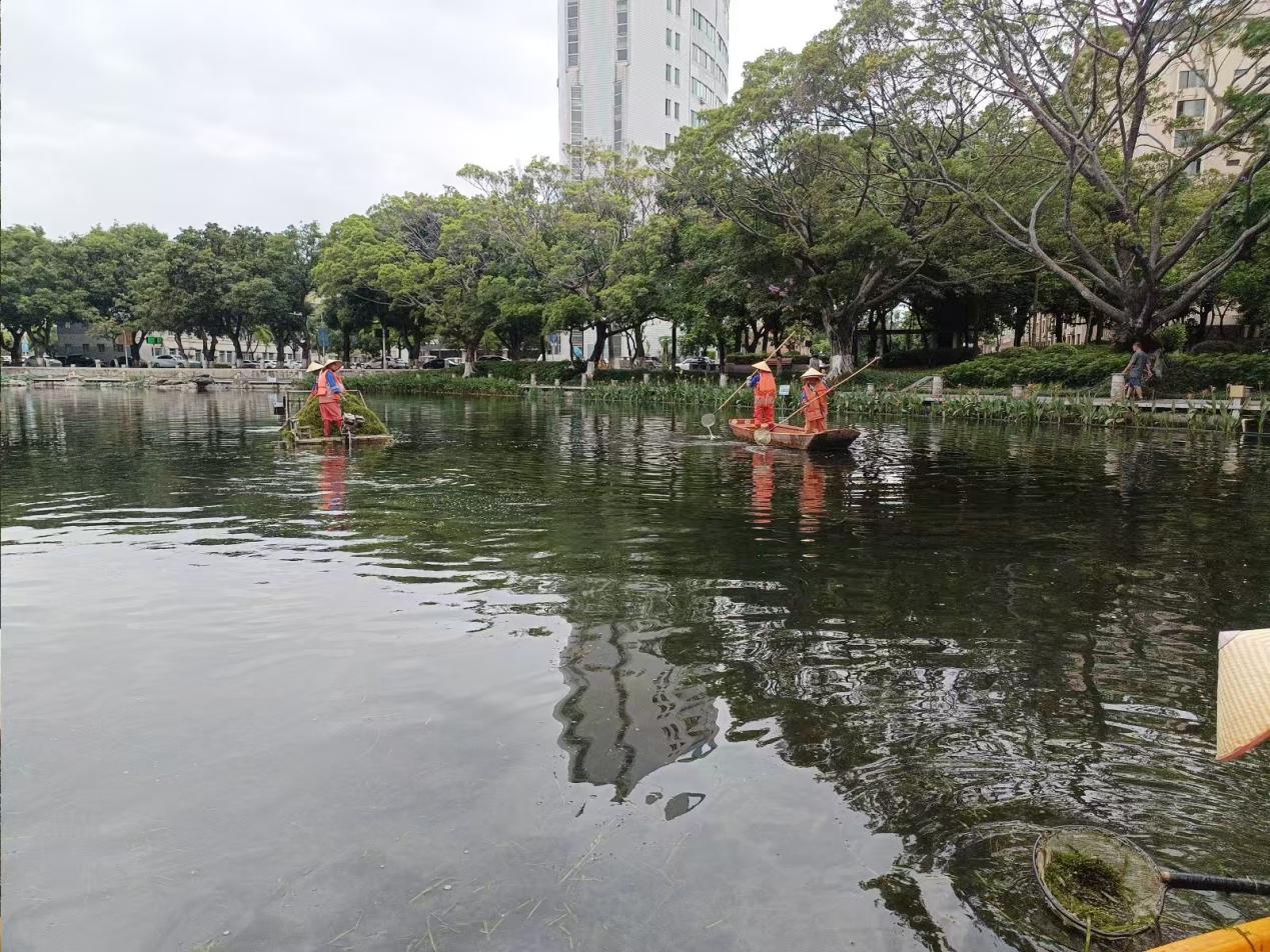 湖泊运维员每日进行湖面保洁、清理湖面油膜垃圾,保持水面干净整洁;对镜湖、鉴湖、翠湖、荷湖、莲湖、爱莲湖、彩蝶湖、大碧云湖、月牙湖、紫荆湖等湖泊驳岸花带修剪;镜湖、鉴湖、翠湖、春花湖、秋实湖、莲湖、荷湖、爱莲湖、彩蝶湖、大、小碧云湖、观月湖、绿榕湖进行青苔打捞;对秋实湖、西校园假山水池、汇学堂景观池、四教景观池打捞保洁,修剪观月湖、鉴湖、荷湖、莲湖、小碧云湖、大碧云湖枯萎荷叶,各湖病虫害防治,小碧云湖、鉴湖水草修剪,翠湖、月牙湖补种水草。