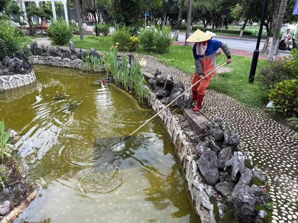 本周控鱼总计打捞33斤杂鱼;各湖驳岸治理福寿螺及清理螺蛋,打捞福寿螺及螺蛋总计23斤;16个景观湖4个景观池总计清运垃圾13吨。