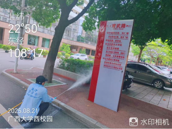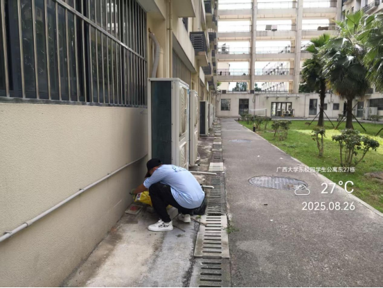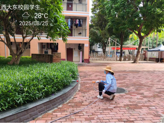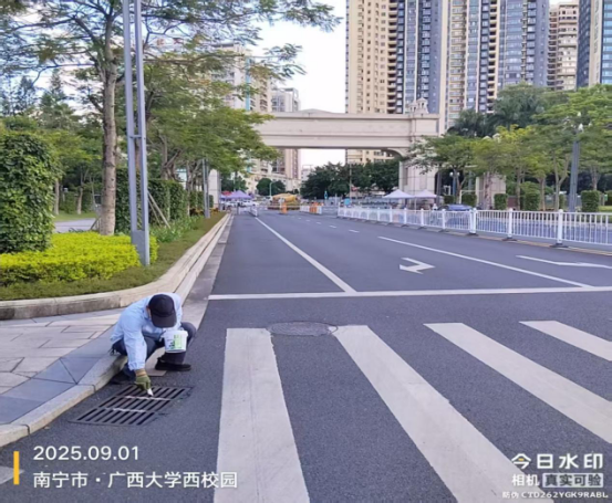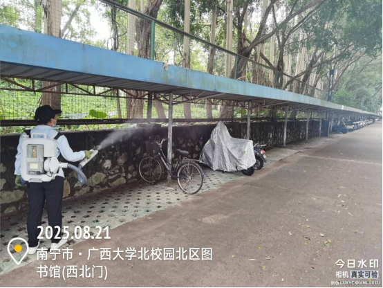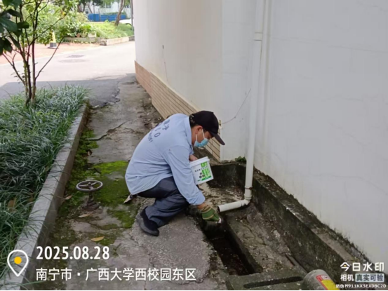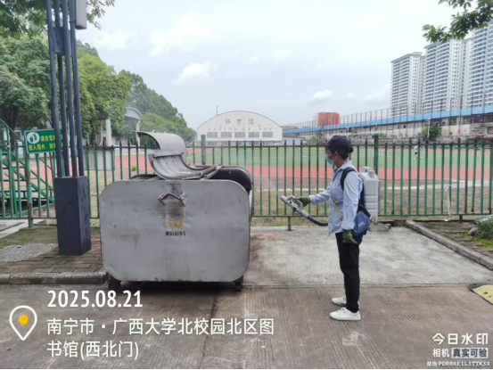 同时,为迎接2025年秋季开学,保持良好的校园卫生环境,病媒生物防制板块于8月18日起至9月6日对东、西校园和北校区的教学办公区、教职工住宅区、学生公寓区等外环境实施新一轮灭鼠杀虫、白蚁、红火蚁等病媒生物防制工作。防制范围包括所有的教学楼、办公楼、教职工住宅楼、食堂、农贸市场、医院、科研基地、仓库等外环境以及校园的主次干道的下水道口、公厕、垃圾桶(箱)、绿化带、雨水沟等,实际有害生物防制面积约136万㎡。其中绿地30多万㎡,下水道、化粪池及各类地井约3500个、小型污积水体约1万㎡,防制的主要内容包括对上述区域外环境的鼠、蚊、蝇、蟑螂等病媒生物及红火蚁、白蚁进行有效防制。