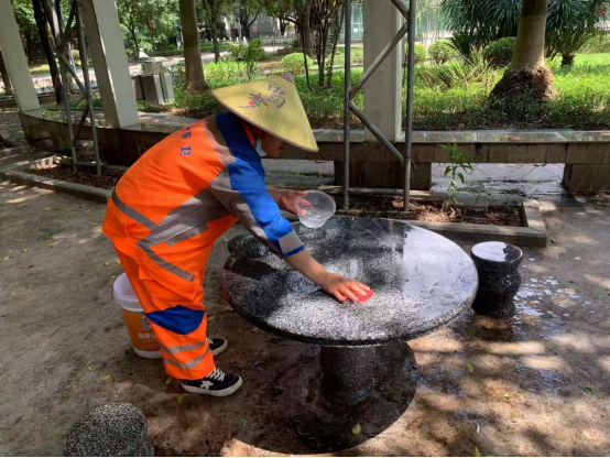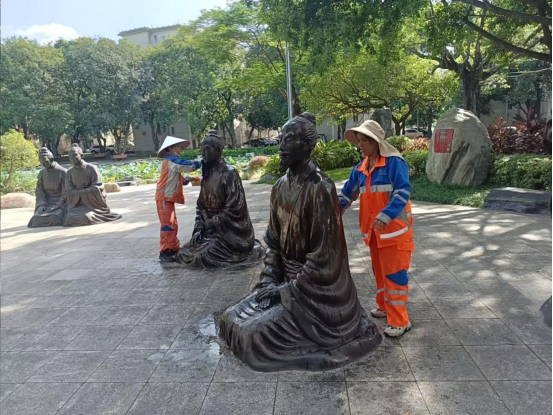 暑假期间,环卫保洁人员继续做好校园各区域环境卫生清扫保洁工作,每日清晨五点半开始采用“人机结合”的方式清扫校园各大校道及支道,日常及时清理绿地枯枝落叶和白色垃圾,清洗铜像、果皮箱、清理水沟、雨篦子等,保持校园环境干净整洁。环卫保洁总面积近80万㎡,人均保洁6800㎡。