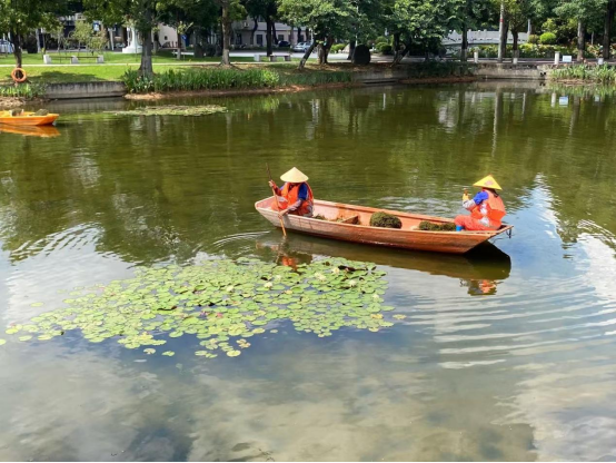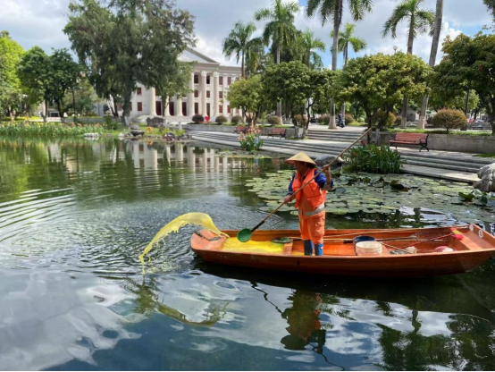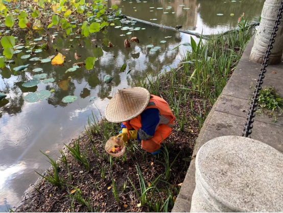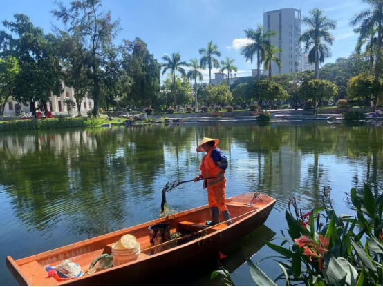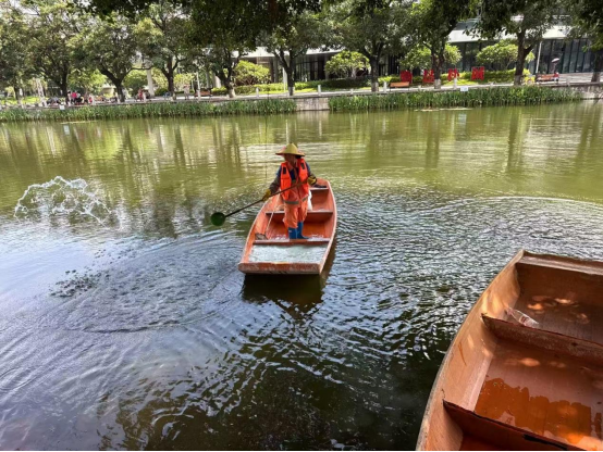 湖泊运维员每日进行湖面保洁、湖面油膜垃圾清理,保持水面干净整洁:对小碧云湖、大碧云湖、莲湖、翠湖、彩蝶湖、鉴湖、镜湖水草修剪;对彩蝶湖、爱莲湖、翠湖水草裸露区域进行补种;对大碧云湖、镜湖、鉴湖、月牙湖、绿榕湖进行水质调理;打捞青苔;对西校园体育场西北角假山景观池、汇学堂周边景观池、劝学岛景观池进行清淤冲洗;